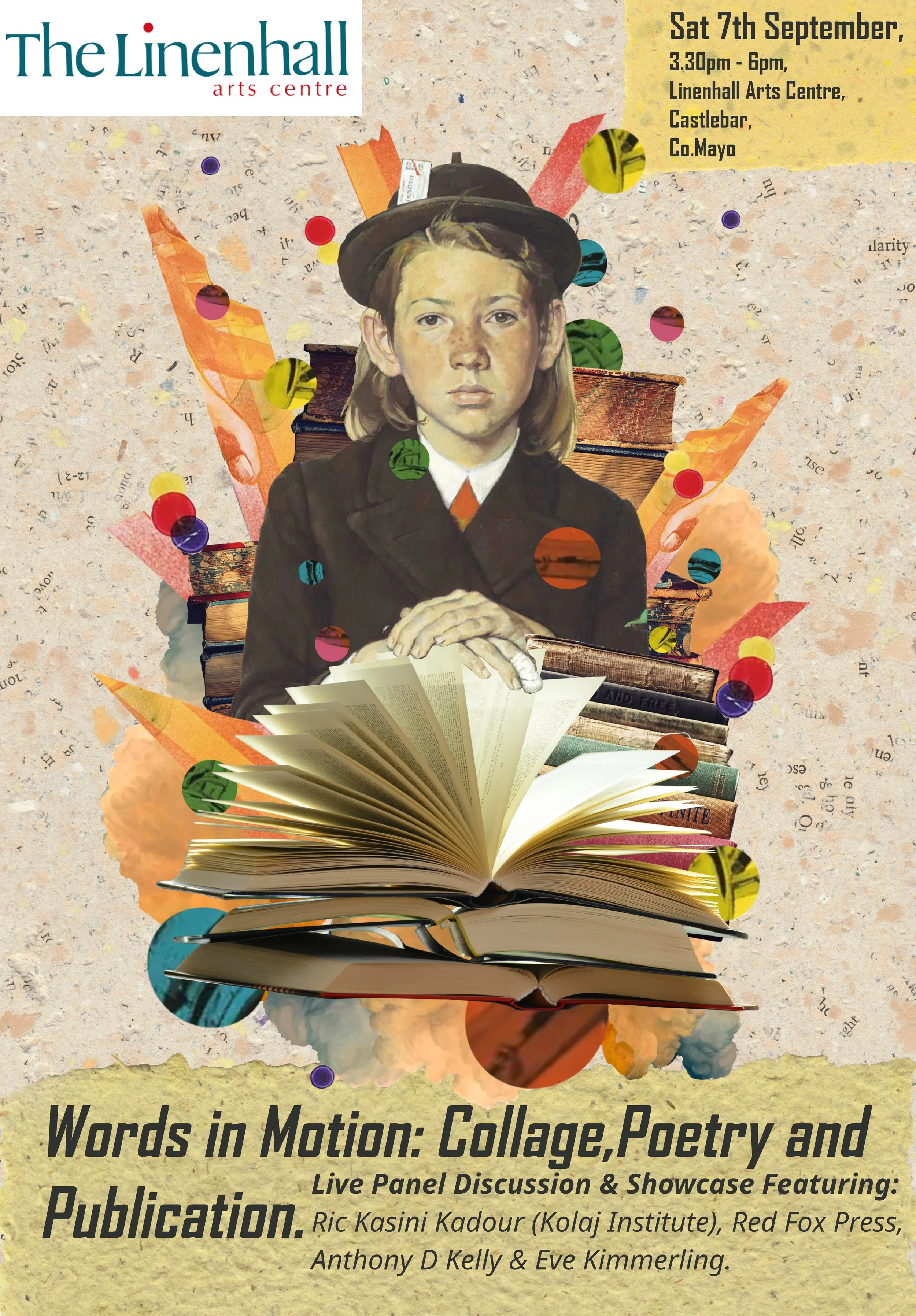 As part of our exploration into the potential of Collage as a medium we opened a panel discussion and special event on Collage, Poetry and Publication.  We were delighted to have REDFOXPRESS attend in the lobby of the Linenhall Arts Center. REDFOXPRESS are a dynamic duo based in Dugort, Achill, Co.Mayo and their beautiful art books have risen to international prominence. I was joined on stage by the poetic collagist Eve-Marie Kimmerling and live by satellite by Ric Kasini Kadour founder of Kolaj Institute and Magazine; for a rich and vitalizing discussion of the intersections and opportunities which arise amongst these practices.